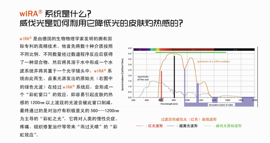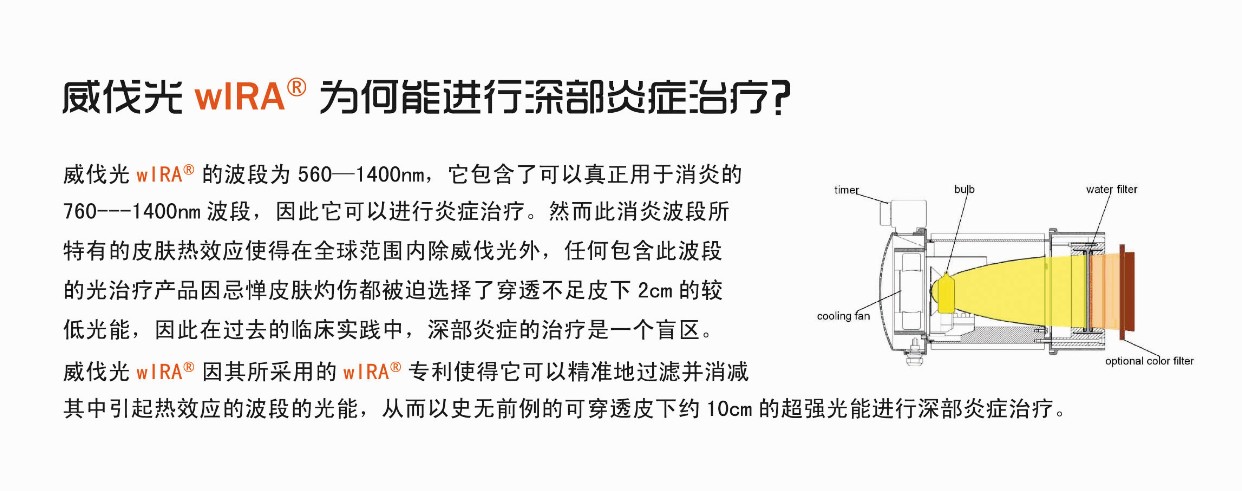 在全球医学领域除威伐光外,可真正用于炎症治疗的760nm—1400nm波段的光治疗产品为避免皮肤灼伤都被迫降低了光能,以至于均无法穿透皮下2CM并对各种2CM以上的慢性炎症无能为力。WIRA®专利打破了这一瓶颈并使得威伐光可穿透皮下10CM。
