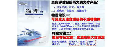 首先我们先看一下过去非常流行的各种可见光类的产品,如红光、红蓝光等,它们的穿透深度会是多少呢?要回答这个问题其实很简单,我们在初中的物理课本上就已经得到了答案:任何可见光都会被不透明的物体所阻挡,红光、红蓝光等在还没有穿透到病变组织前就已经完全被不透明的平滑肌、骨骼、结蹄组织等阻挡,所以红光、红蓝光等产品不可能对深部的炎症有任何作用!因此很多来自欧美的医疗专家无法理解中国为何如此盛行红光的治疗并推出了很多深部治疗的文献;用样也可以理解为何在欧美等地举办的国际医疗展会上几乎没有任何红光、红蓝光类的产品展示;这也是为何我们每年参展德国杜塞尔多夫展会时,德方的专家会问中国的代理商:你知道十字路口红绿灯的LED光源与你们所说的红光没有区别吗?在德国说红光可以深部消炎,说红光可以标价几万甚至十几万是多么的不可思议!很可惜这些最基本的科技常识早已被大多数红光、红蓝光的厂家为了各自的利益所进行的夸大宣传所湮没。甚至红、蓝光的宣传彩页都“走火入魔”般的鼓噪可以穿透3-5cm,但在大家通过对物理常识的简单普及------任何可见光无法穿透不透明物体后,全部恍然大悟并且瞬间理解了红光、蓝光等作为可见光会被不透明的骨骼、肌肉等阻挡!