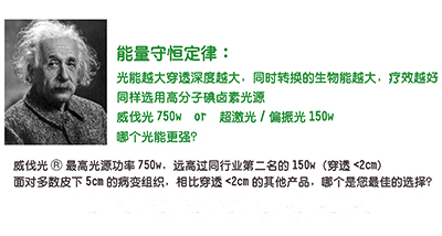 在物理常识中,红外光可利用其光热效应等物理特性进行有效穿透,近年来地震中的红外生命搜救仪,以及医学体检中的红外热成像仪的应用都很好证明了红外光可以穿透生物组织的这一特性。然而,作为同样包含760~1600nm红外消炎波段的超激光、偏振光、威伐光,尽管它们同样选用高分子碘卤素光源,但在能量守恒定律的前提下,光源功率<150w的超激光、偏振光,与高达750w的威伐光®相比,它们在深部病变组织的消炎止痛等方面的疗效势必存在天壤之别。因此可以依据150w所穿透的0~2cm深度,以及750w所穿透的7~10cm深度,轻松判断面对多数皮下5cm以上的关节炎、急性扭挫伤等疼痛源,哪种产品更加自信。