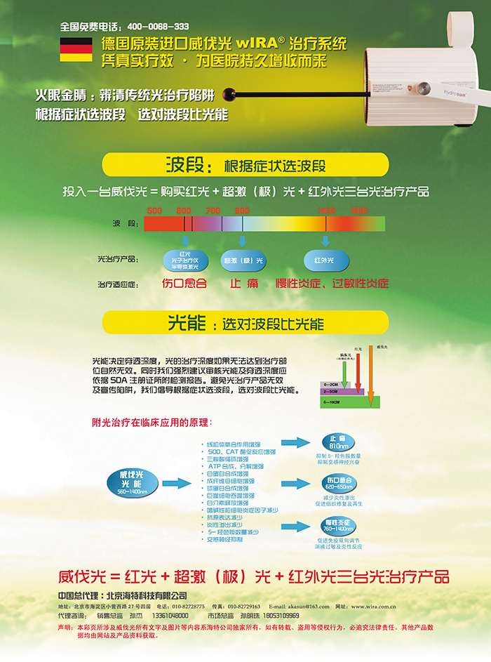 同时国家对康复、慢性病等领域的重视程度也与日剧增。然而当今医学技术在手术、急诊、重症等大病治疗领域取得日新月异的迅猛发展之时,我们也颇无奈的发现在鼻炎、咽炎、慢支、前列腺炎、妇科炎症、腰颈椎压迫疼痛、关节炎等慢性病领域并无多少新的技术被患者认可。很多时候我们会面临这样一些颇为尴尬的局面:我们现有的治疗手段和各种慢性病治疗仪相当不给力!过敏性鼻炎患者依然在用组胺类或激素类药物;鼻炎患者依然在用鼻炎片;咽炎、慢支患者依然在用喉宝或止咳糖浆;颈腰椎增生患者依然在能保守治疗时选择休息、热敷、或按摩推拿……这些人群中有多年病史的患者早已习惯在药店熟练的选择自己的药物而不再去医院就医或去医院买药。在这种尴尬的背后医院怎样才能持久增收?所有的问题其实可以用一句话回答:患者没有治疗信心自然不会接受治疗!不接受治疗医院自然难以持久增收! 回顾目前医院里所有的慢性炎症治疗仪(主要是光治疗仪),它们很难在患者心智中占据一个“治疗有效”的位置,多数医护人员也对这些光治疗仪的疗效感到无奈,究竟是什么原因造成这种局面?我们可用一句话对这些慢性病尤其是慢性炎症的消炎作用无效的现象进行总结:有消炎资格的没治疗深度,有治疗深度的没有消炎资格。 有消炎资格的没治疗深度:实验数据证实,包含760---1400nm波段的光治疗仪在消炎领域有很好的效果,然而这类设备如偏振光在临床使用中通常仅对浅表性的消炎治疗有效。比如很多偏振光对手指及足部的扭伤以及浅表性挫伤有疗效,但对同样的肩部、膝关节、腰颈椎等深部消炎基本无效,尤其是深部组织的消炎如鼻炎、中耳炎、前列腺炎或盆腔炎等几乎没有任何有效的口碑。其中的原因就是这些真正可用于炎症治疗的760---1400nm波段的光不可避免的均存在明显的皮肤热效应,这使得所有该波段光治疗仪为确保不会灼伤患者,均采用了穿透不足皮下2CM的光能进行治疗,因此这类光治疗仪对于普遍存在的大量病变组织在5CM以上的慢性炎症患者束手无策。 有治疗深度的没消炎资格:目前众多红光、红蓝光、超激光等设备其波段分别包括430nm左右的蓝光、620-650nm的红光、810nm的超激光等,这些波段的皮肤热效应相对760---1400nm的消炎波段弱了很多,所以它们的光能和穿透深度较深。然而由于产品的波段不属于760---1400nm的消炎波段,因此这些产品分别对皮肤类座疮、伤口愈合、疼痛治疗等有效,但在炎症治疗中却没有明显效果,因为760---1400nm的波段才对炎症治疗有效。目前临床中各科室的实际使用情况也能证明这一结论。 然而这一切慢性炎症领域的治疗现状必将被德国原装进口威伐光wIRA®深部炎症治疗系统所改变!威伐光的波段为560---1400nm,其中所包含的760---1400nm波段可有效进行炎症治疗,同时因威伐光采用了全球独家wIRA®专利,它可精准削减能引起皮肤热效应的波段,并且可安全保留穿透接近皮下10CM的有治疗价值的其他消炎波段,因此它可以广泛应用于慢性炎症的治疗。 威伐光wIRA®----全球深部炎症治疗开创者 在欧洲连续11年销量占同类产品的三分之一 2012年,每100台炎症治疗系统的采购中,威伐光独占87台!